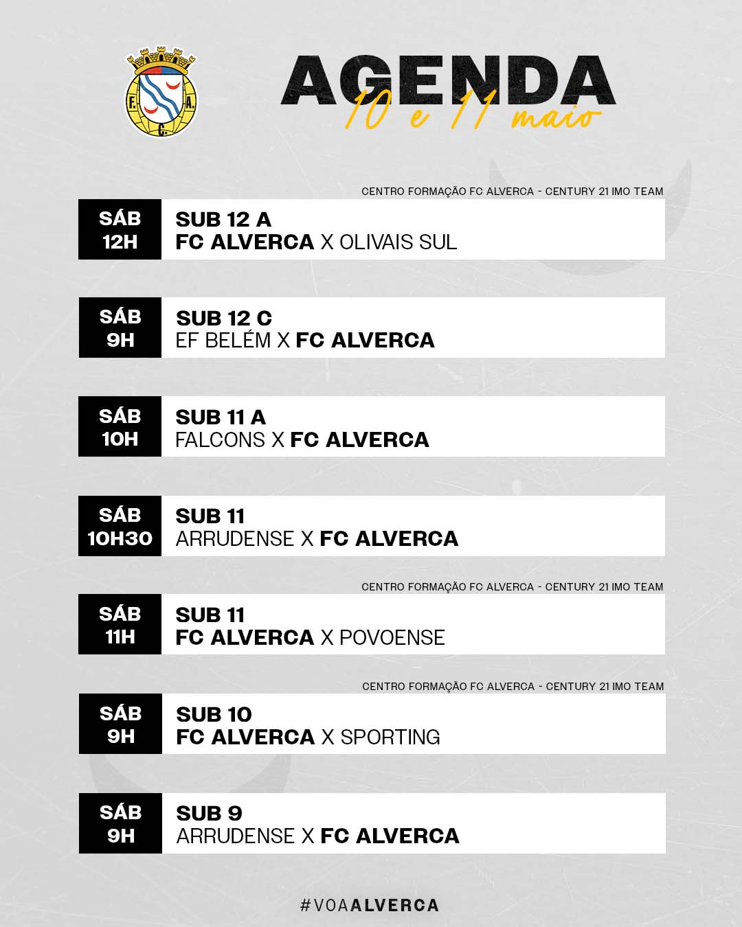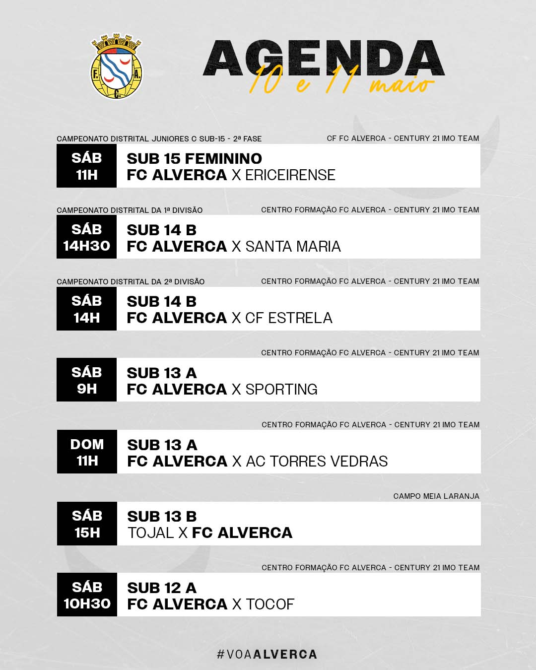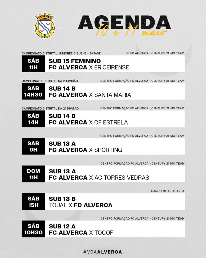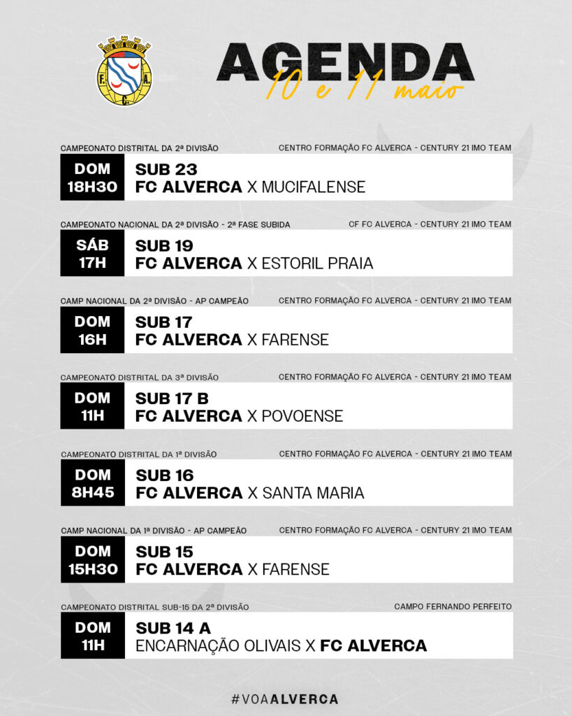 Confere a agenda dos jogos do FC Alverca para os dias 10 e 11 de maio.
