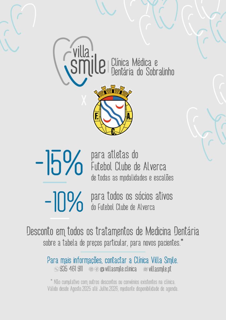 A Clínica Villa Smile, parceira do FC Alverca disponibiliza condições especiais para os nossos atletas e sócios, válidas de agosto de 2025 a julho de 2026.